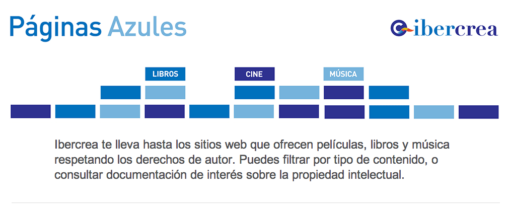 El Instituto Ibercrea es el resultado del empeño común de cuatro entidades españolas de gestión colectiva de derechos de propiedad intelectual. Su objetivo fundamental es extender la convicción de que la propiedad intelectual debe ser respetada. Para ello organiza eventos multidisciplinares de gran calado como las jornadas “La creación del mundo”, que tuvieron lugar en Madrid el pasado mes de noviembre; desarrolla una aplicación que reúne toda la oferta legal de contenidos en internet como Páginas Azules, que acabamos de presentar.