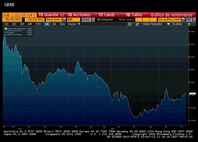 Esta masiva re-localización de fondos –las compras masivas de bonos alemanes están llevando a este país a financiarse a tasas nominales negativas- está provocando la que perfectamente puede acabar siendo la próxima gran burbuja. Como caso extremo, en los últimos meses hemos podido ver rendimientos nominales negativos en varios bonos de 3 años o de vencimientos inferiores de varios países europeos como Dinamarca, Finlandia, Suiza o Alemania. Por ejemplo, aquí podemos ver el gráfico de rendimiento de los bonos a 2 años de Dinamarca.