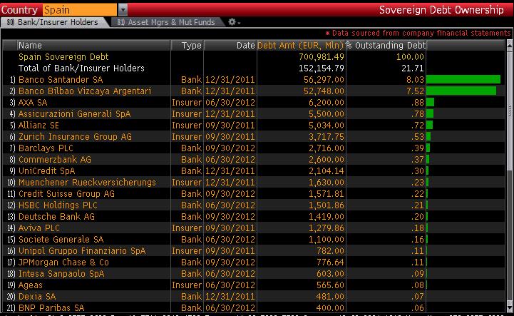 ¿Saben por qué se solapan estos riesgos, verdad? Si echamos un vistazo a las tenencias de deuda pública española reportadas por Bloomberg, miren los dos primeros y principales acreedores de la deuda española: SANTANDER y BBVA.