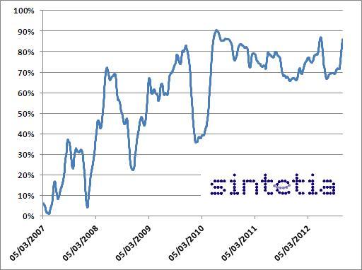 A continuación mostramos el gráfico con la correlación (suavizada) entre el CDS de España y el promedio de CDS de BBVA y SANTANDER. Vivimos en un mundo en que el riesgo “español” prácticamente se solapa entre bancos y Estado. Estas correlaciones, superiores a 80%, parecen normales hoy, pero el gráfico nos sirve pare recordar que el solapamiento no era antes tan normal: